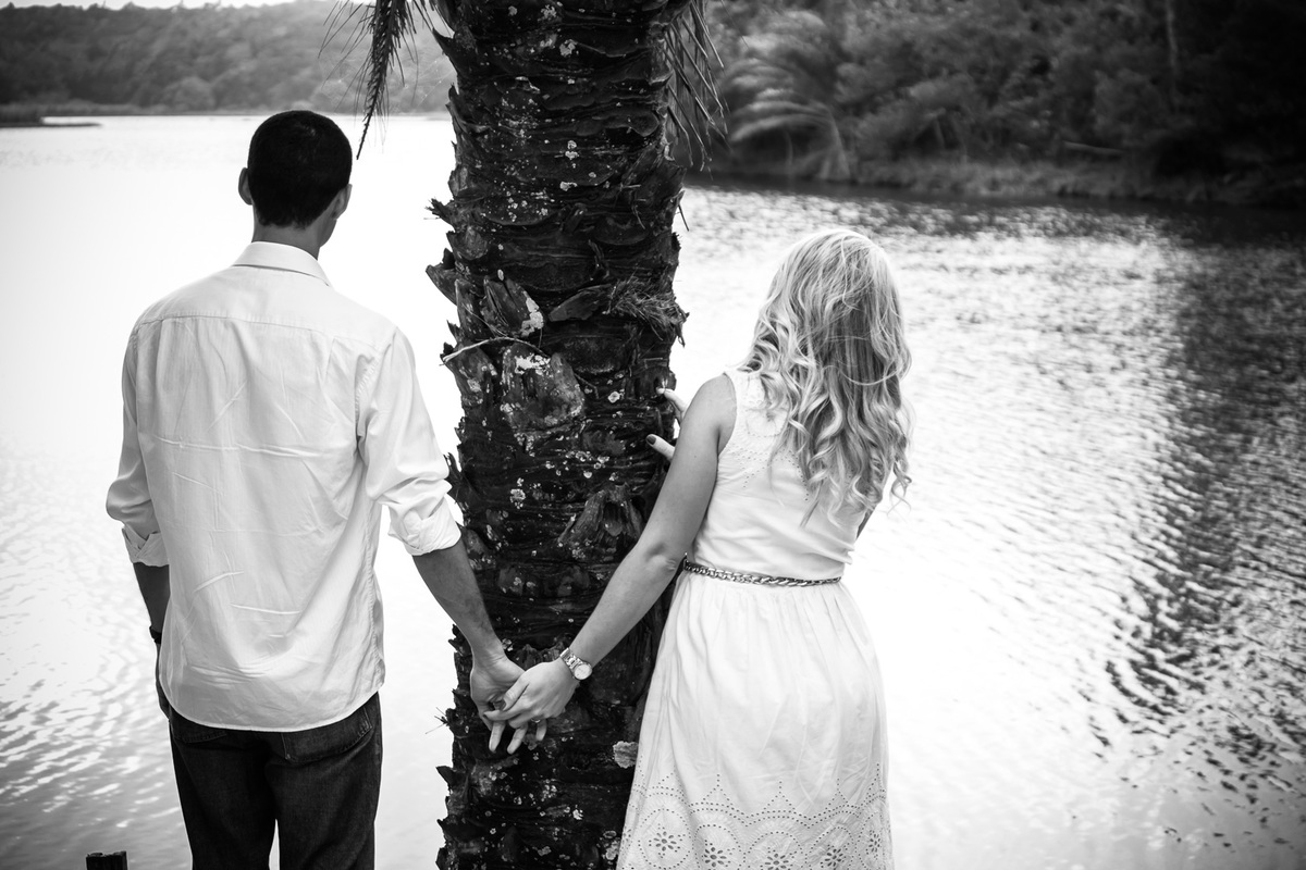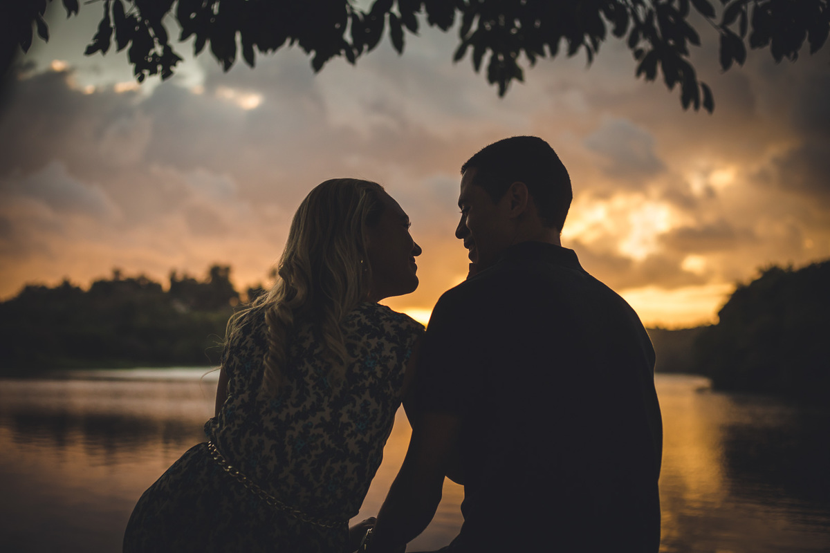 Fotografia de casal, ensaio pré-casamento, casal abraçado sentados olhando o lago e a paisagem no Parque de Pituaçu, Salvador - BA