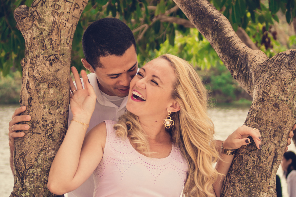 Fotografia de aliança de casal, ensaio pré-casamento, casal abraçado em árvore sorrindo em Parque de Pituaçu, Salvador - BA