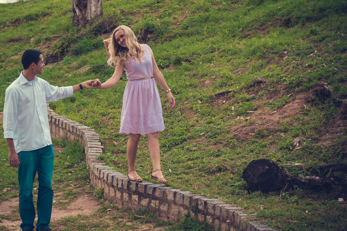 Fotografia de casal, ensaio pré-casamento, casal caminhando no campo aberto e verde em Parque de Pituaçu, Salvador - BA