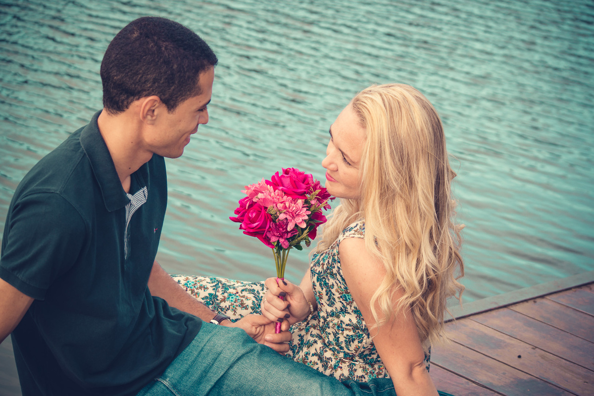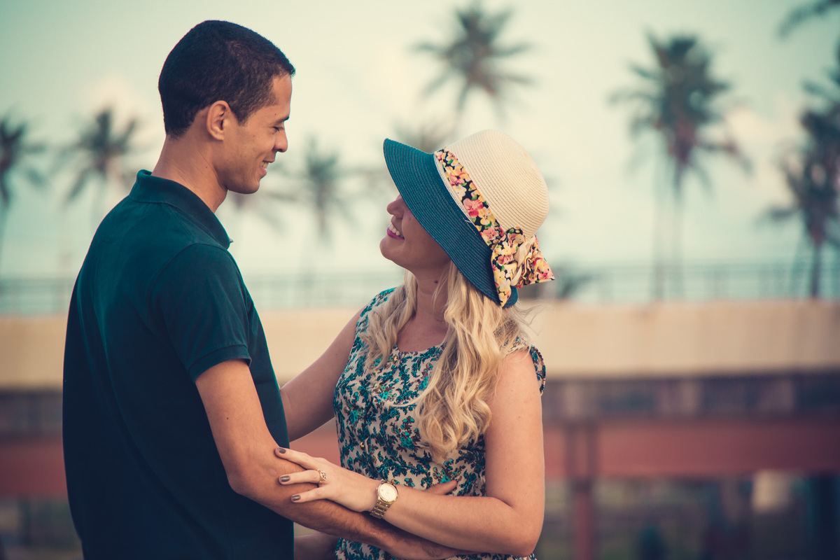 Fotografia de casal, ensaio pré-casamento, casal sentado no pier, cás, abraçados olhando o lago no Parque de Pituaçu, Salvador - BA