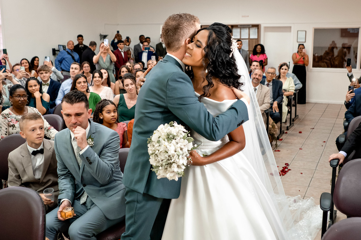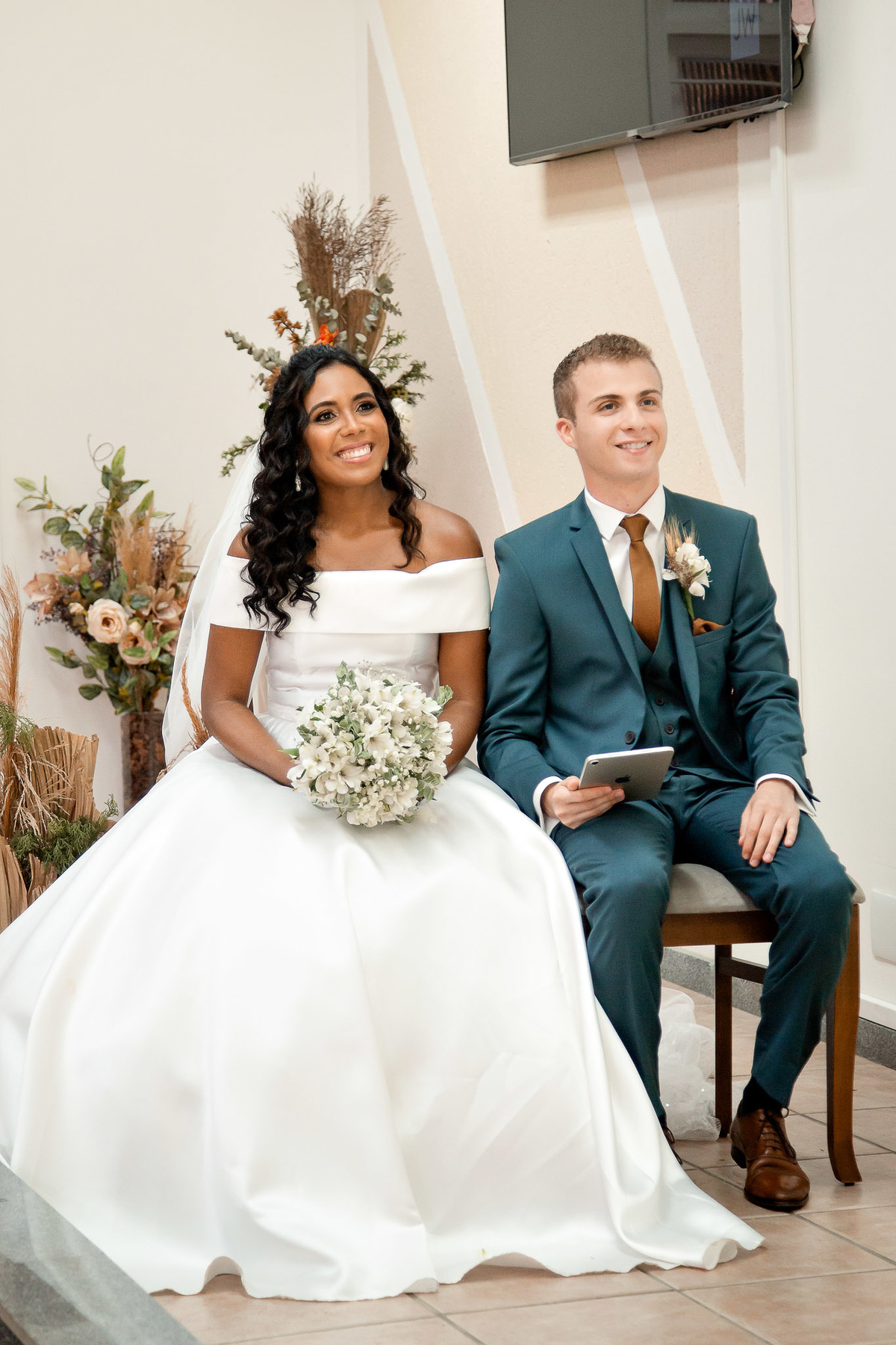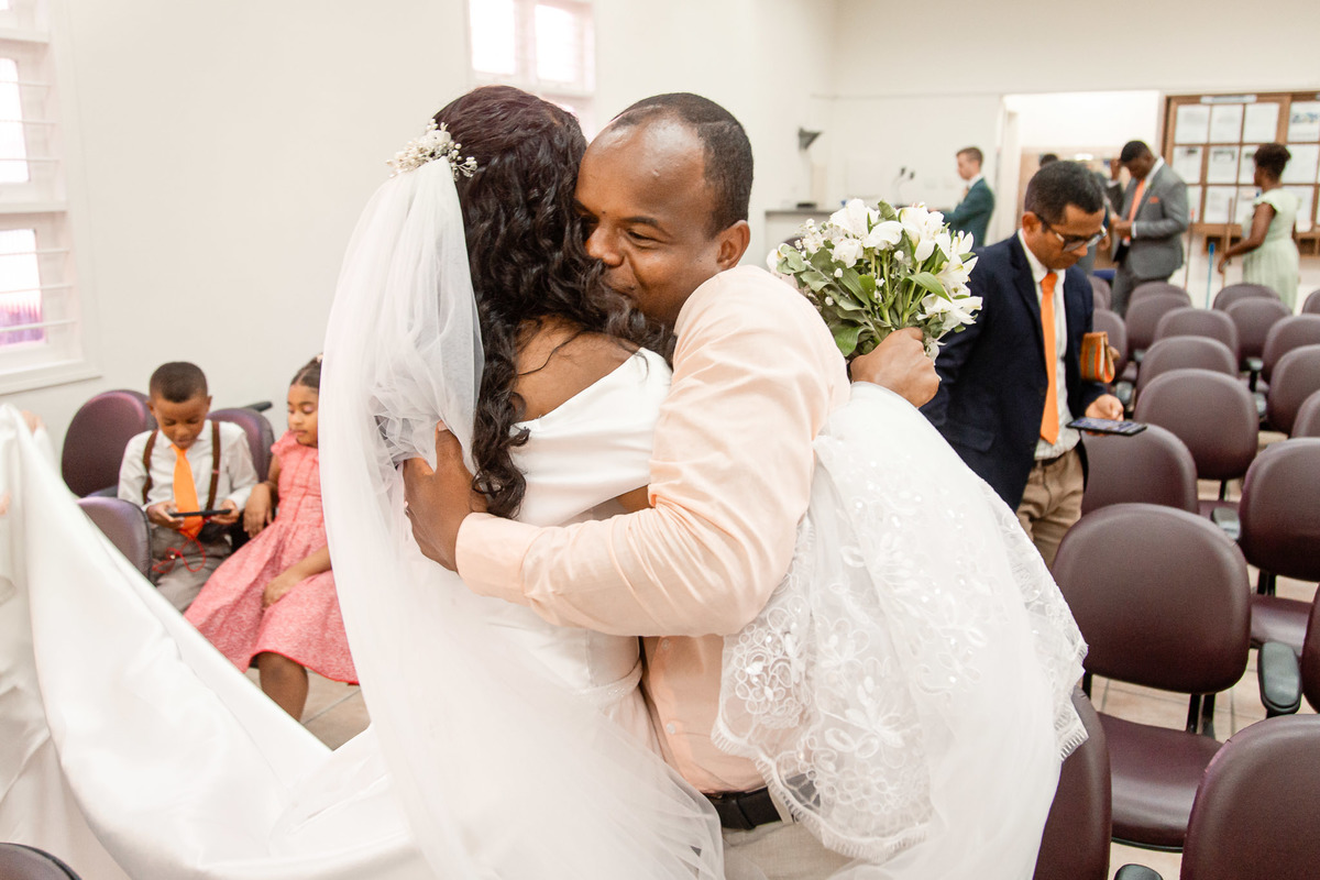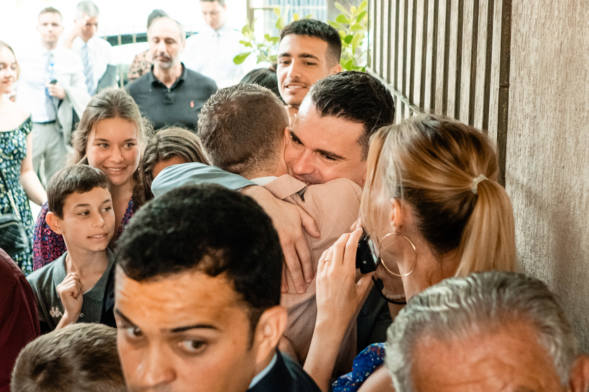 A tarde começou no Salão do Reino, onde Raissa cresceu e onde sua fé encontra lar. A cerimônia, conduzida em português com tradução em francês, foi íntima e profundamente emocionante. A luz suave das janelas criava aquela atmosfera de paz característica do local.