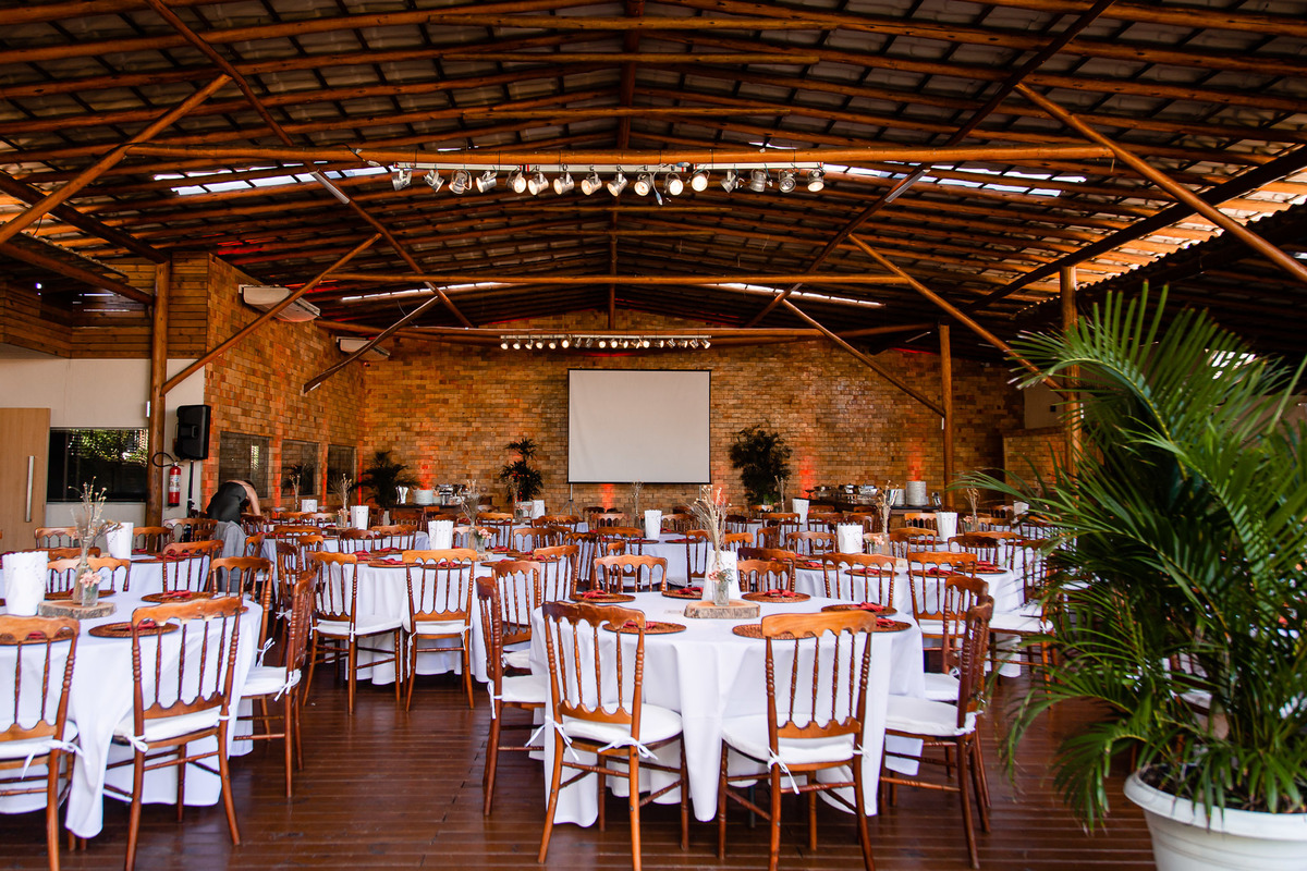 O espaço escolhido oferecia exatamente o equilíbrio que precisavam: natureza tropical exuberante da Bahia (o verde intenso, a brisa do mar a 150 metros dali) com estrutura elegante que todos os convidados puderam apreciar. Um lugar que se adaptasse à história deles, não o contrário.