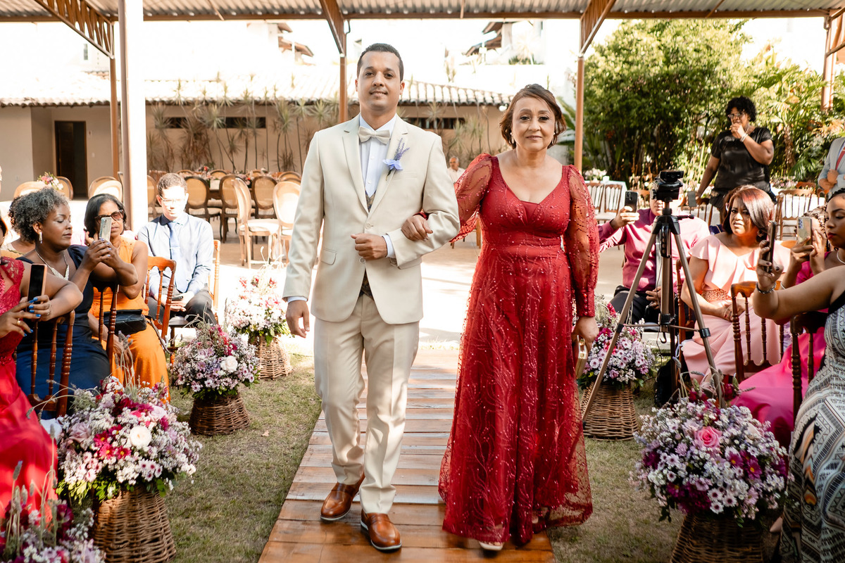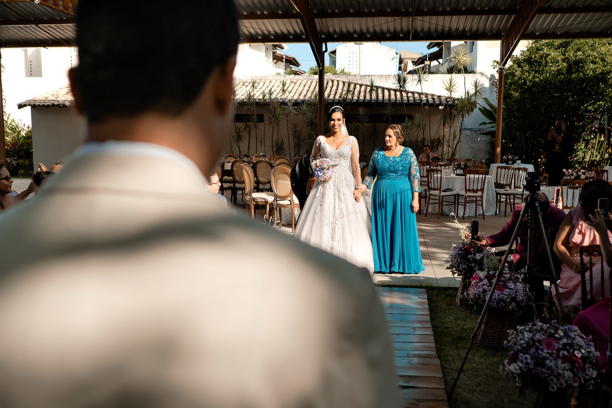 Cerimônia de casamento ao ar livre no Sítio Canto Verde, noivo esperando a noiva em Lauro de Freitas.