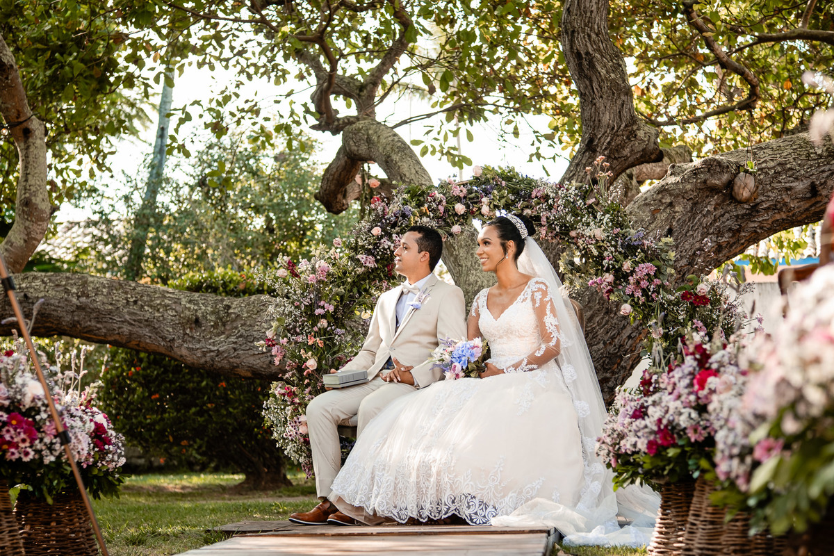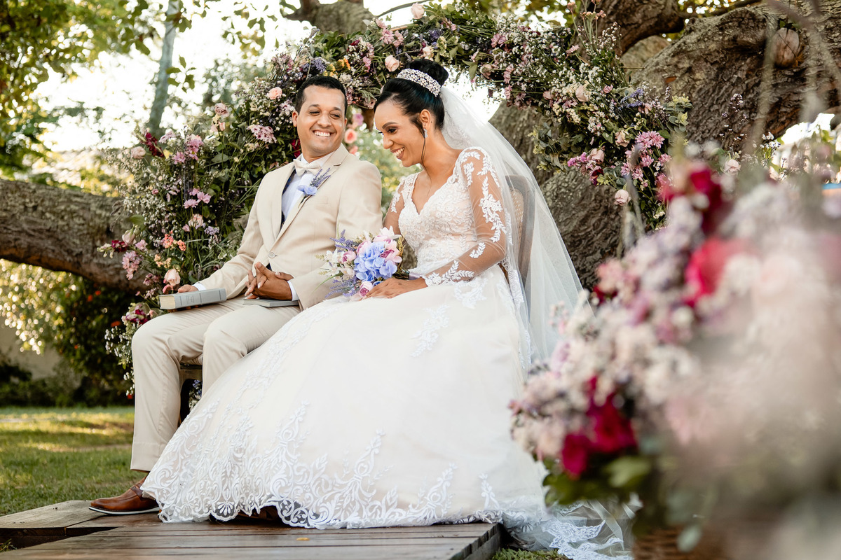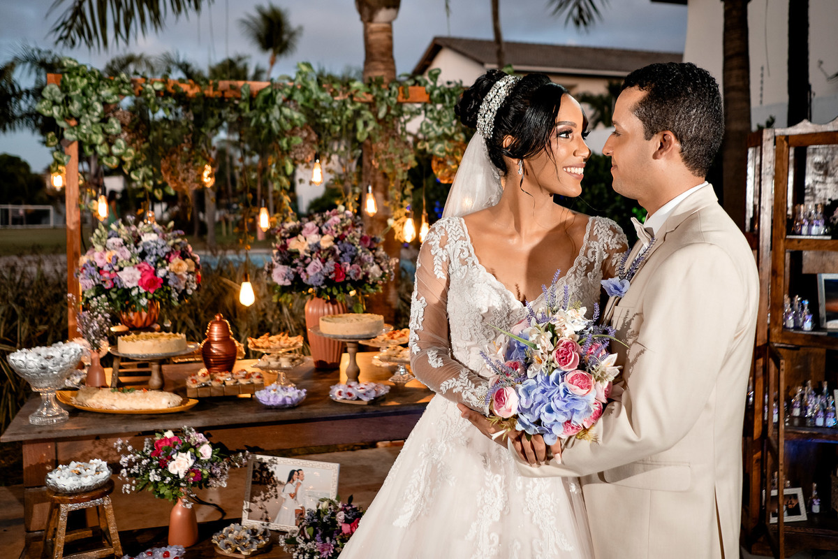 Noiva e noivo na festa no Sítio Canto Verde, casal descansando casamento Lauro de Freitas Bahia.
