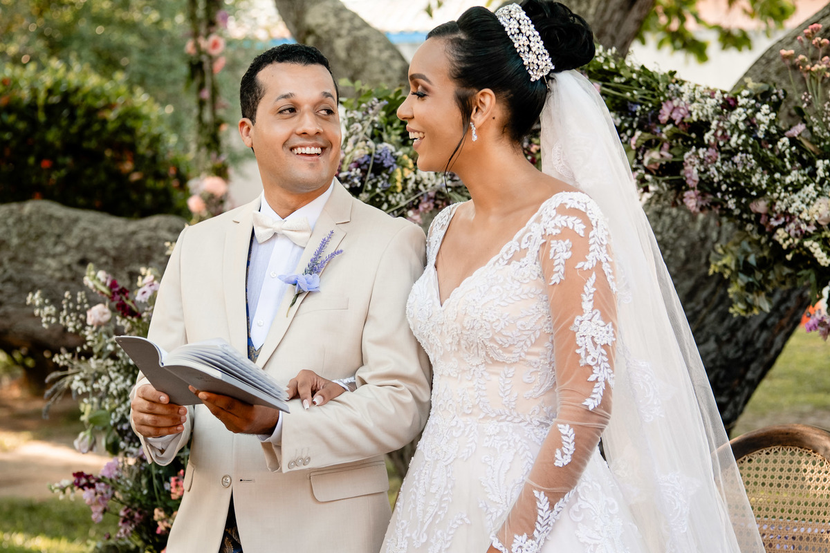 Noiva e noivo trocando alianças ao fundo no Sítio Canto Verde, casal no casamento Lauro de Freitas.