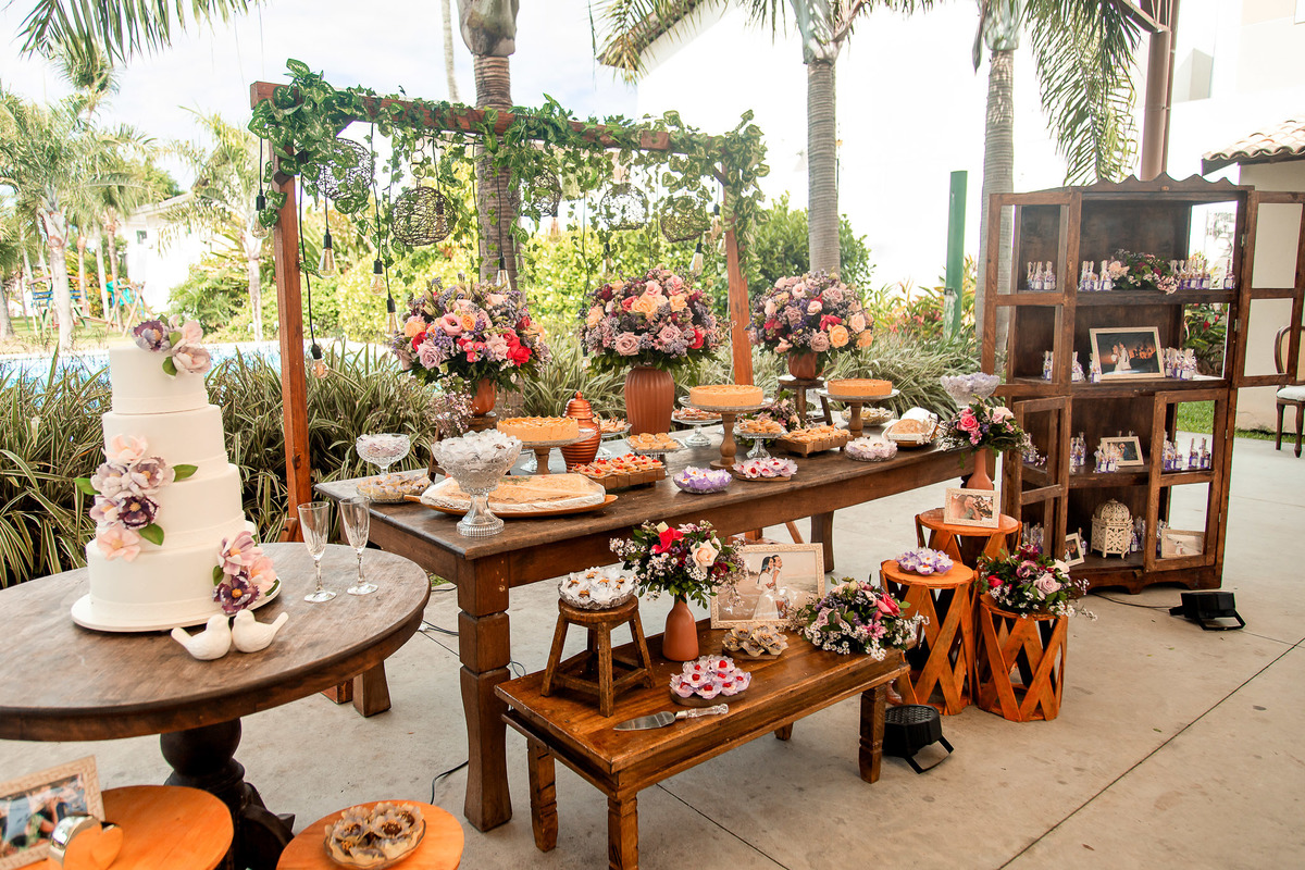 Mesa de comidas no Sítio Canto Verde, mesa de doces casamento Lauro de Freitas com sobremesas.