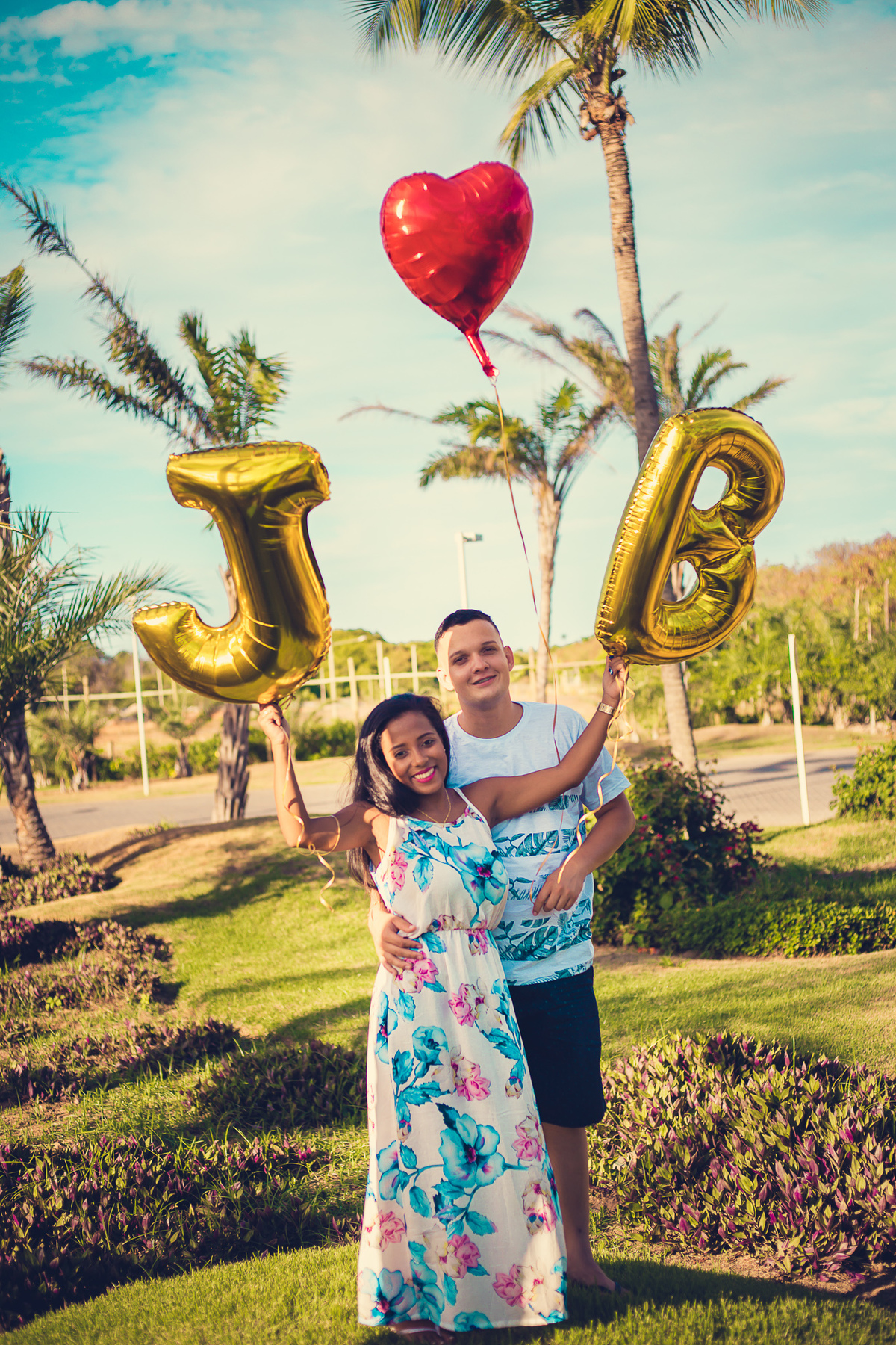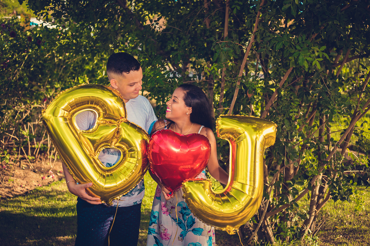 ensaio de casal com fotografia com balões infláveis na praia do forte